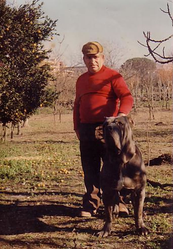 In his book from 1975, "Il Molosso," Felice Cesarino has dedicated the first chapter to Don Carlo, who he describes as his master and teacher who introduced him to the world of Mastino around Vesuvius. He says that it is the case in the scene of Mastino, to learn about the people, to experience, discuss and observe them. Otherwise one can never discover the magic of this Neapolitan breed. And if one looks at the photo of Don Carlo in Cesarino's book, one sees the same Italian world of 'strong men'.